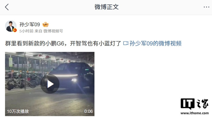 新款小鹏 G6 汽车上路视频曝光: 开启智驾将亮“小蓝灯”